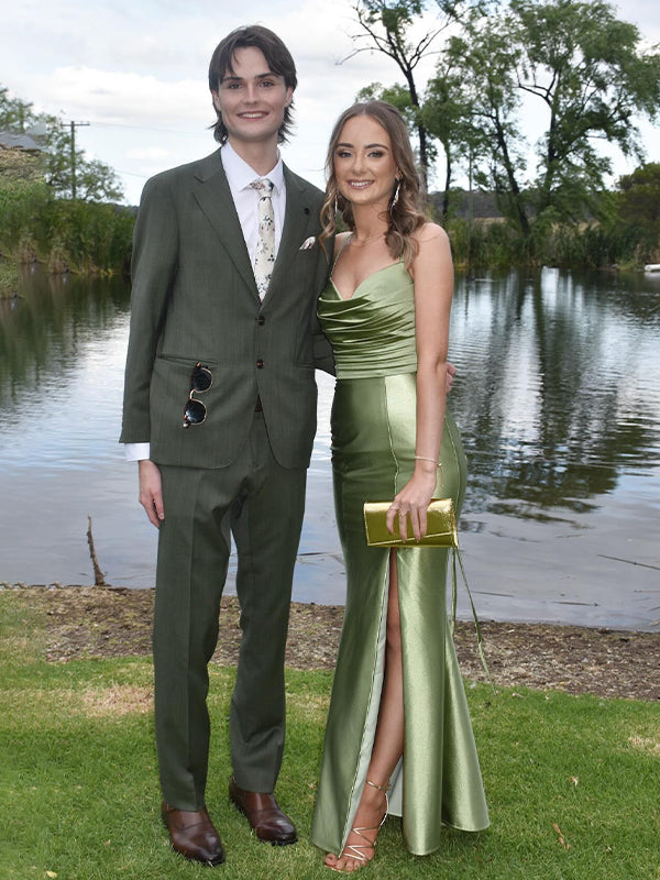 Sage Green Mermaid Cowl Neck Satin Fitted Prom Formal Dress with Slit