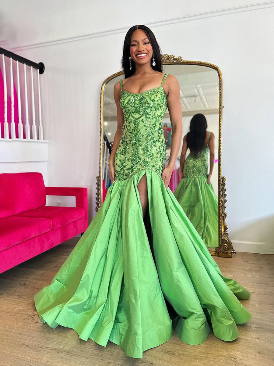 Green Mermaid Satin Sequin Beaded Long Prom Dresses with Slit
