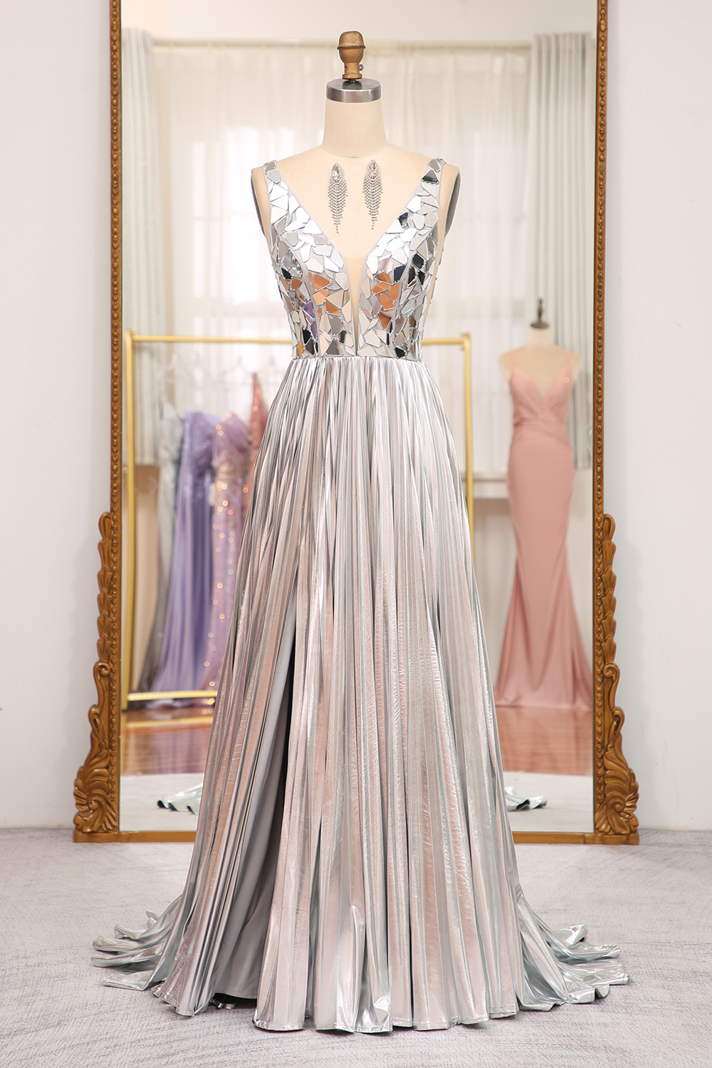 Sparkly A Line Deep V Neck Silver Long Prom Dress with Beading