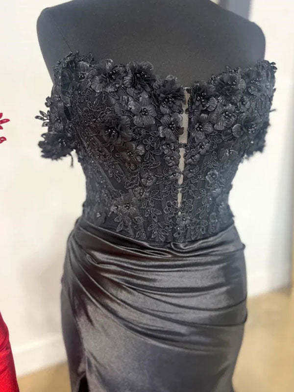 Black Mermaid Appliques Pleated Long Prom Dress with Slit