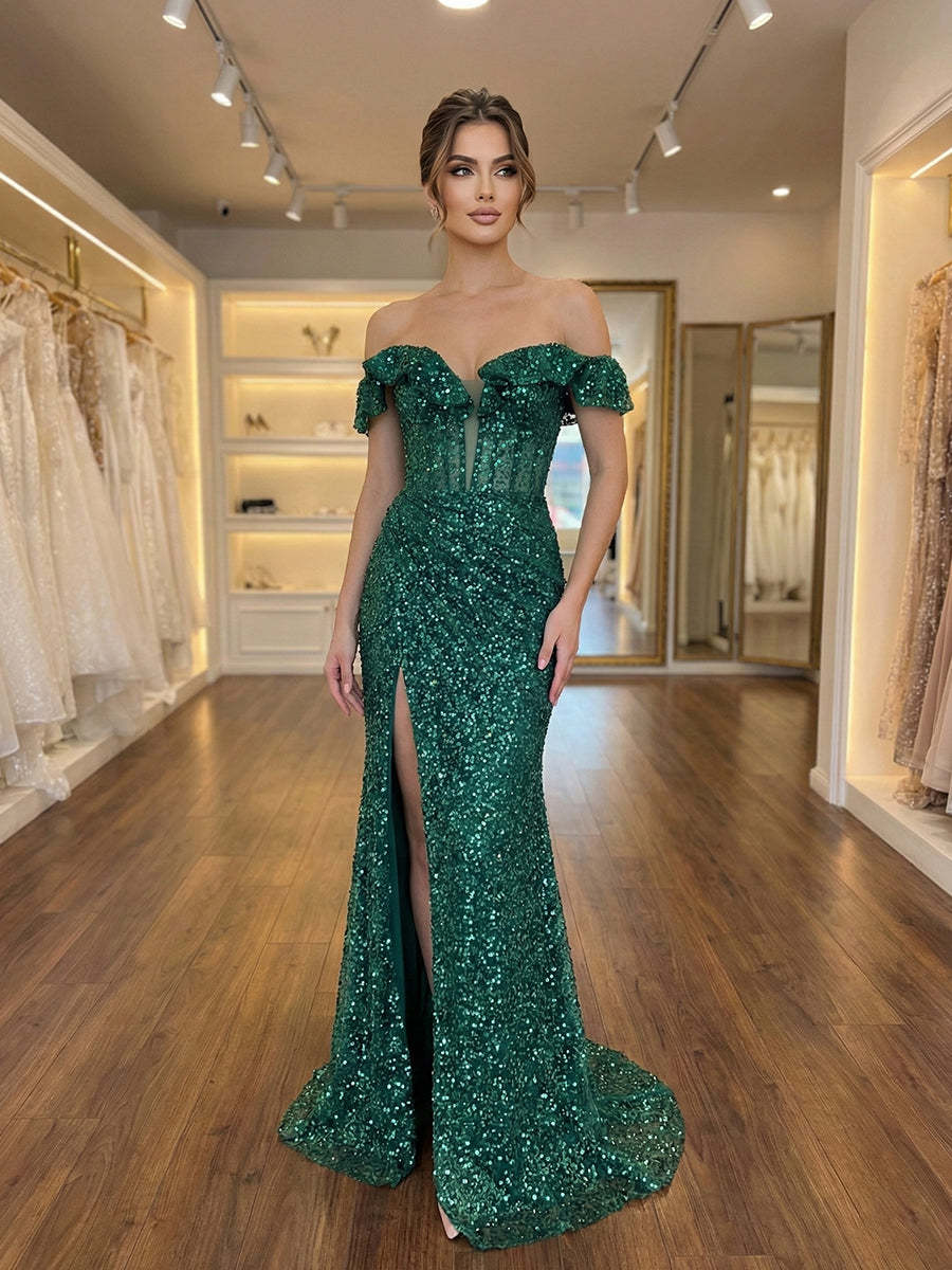 Emerald Off The Shoulder Sequin Mermaid Long Prom Dress with Slit