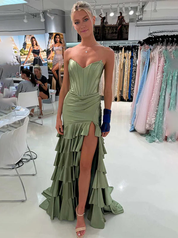 Green Mermaid Strapless Pleated Tiered Long Prom Dress with Slit