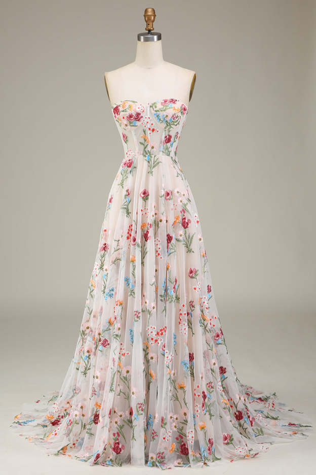 Ivory Sweetheart Tulle Embroidery A-Line Long Prom Dress with Sweep Train