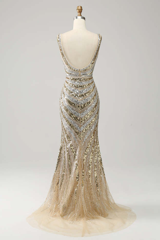 Sparkly Golden Mermaid Deep V-Neck Long Prom Dress with Silt