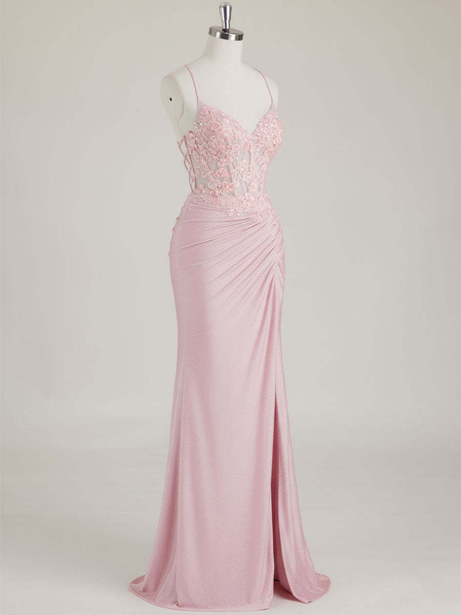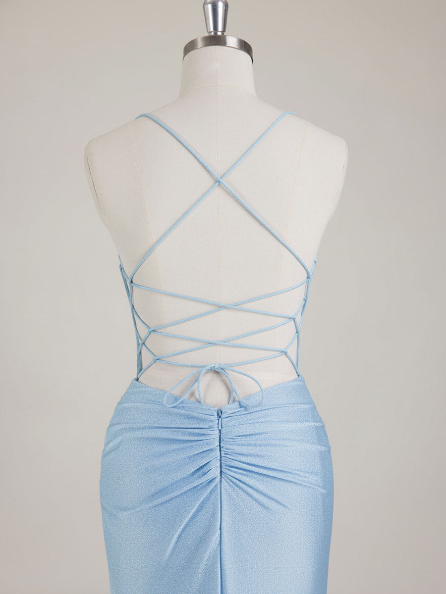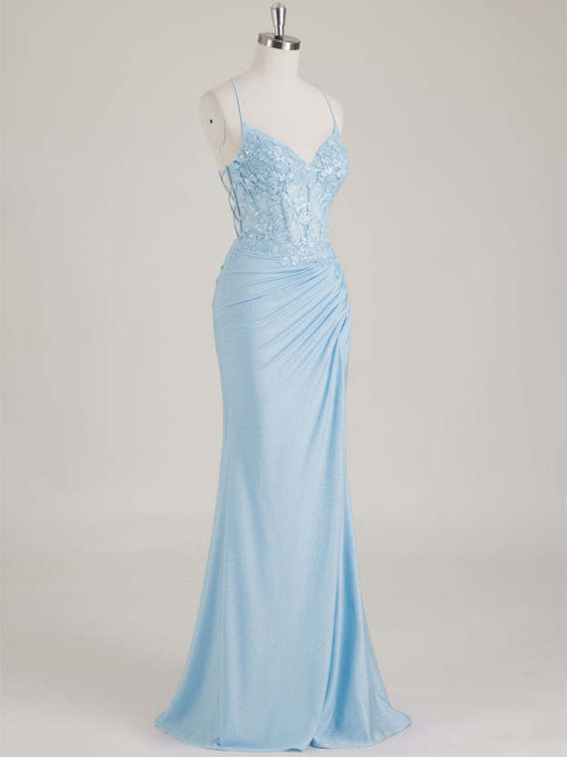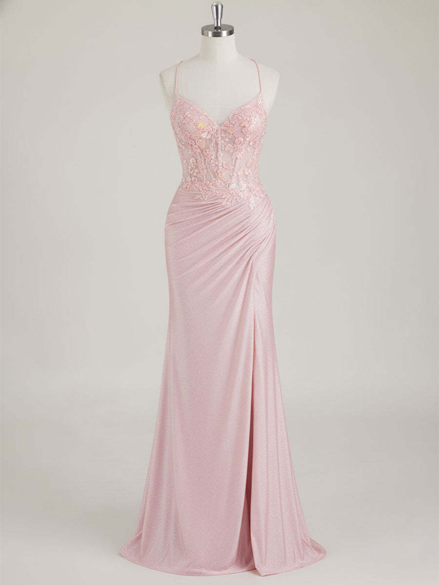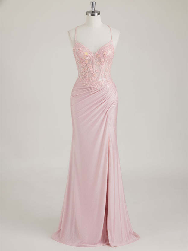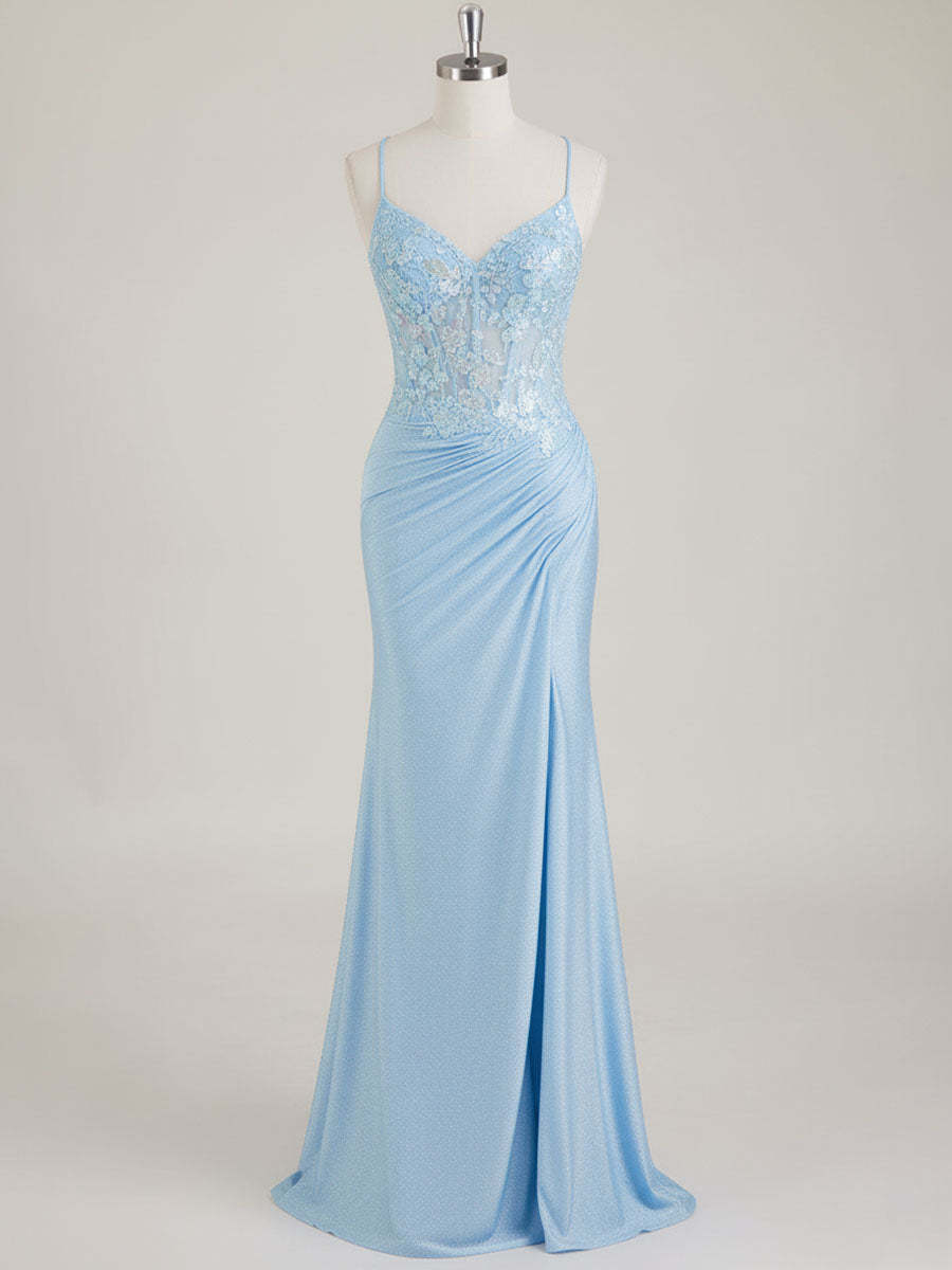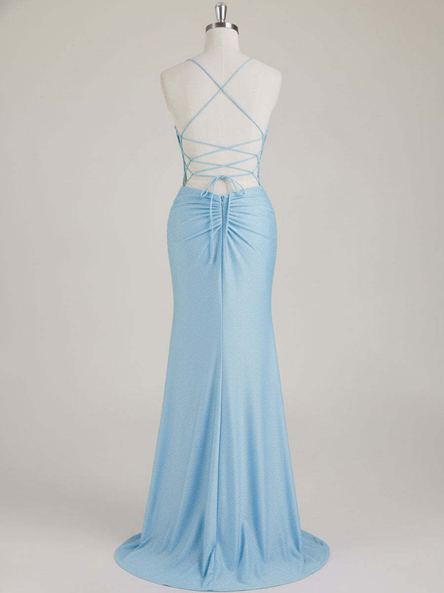 Mermaid Spaghetti Straps V-Neck Sequins Prom Dress with Slit