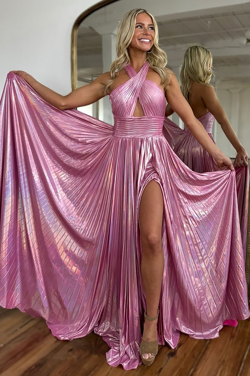 Metallic Blush Halter Neck A-Line Pleated Long Prom Dress with Slit