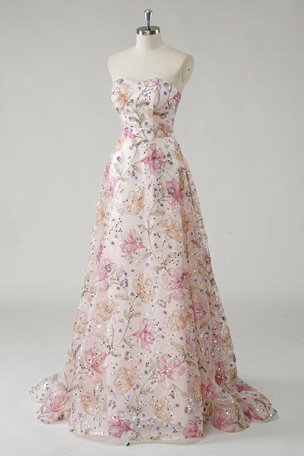 Pink Floral Embroidery Sweetheart Sequins Princess Long Prom Dress