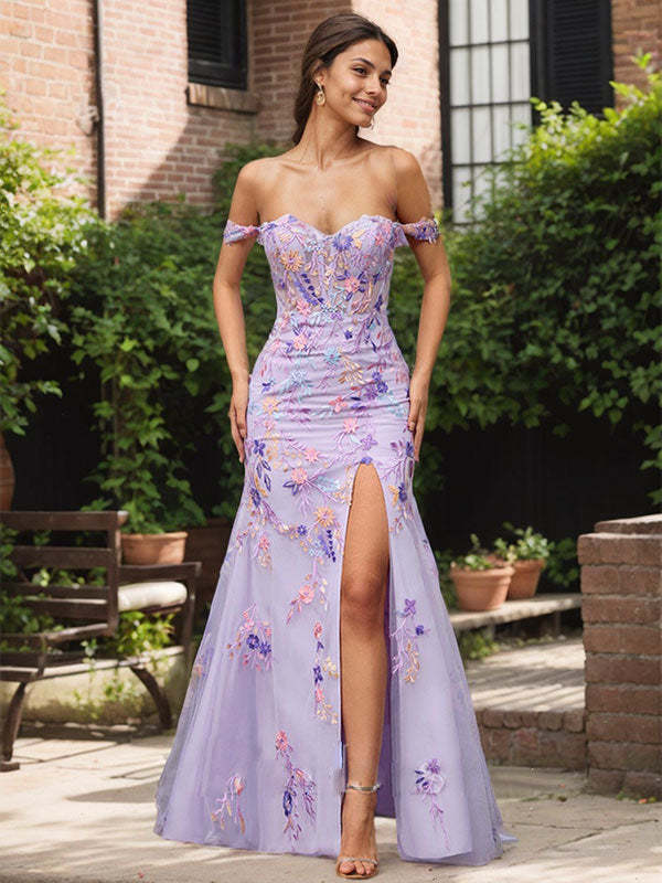 Purple Floral Mermaid Off the Shoulder Long Prom Dress With Slit