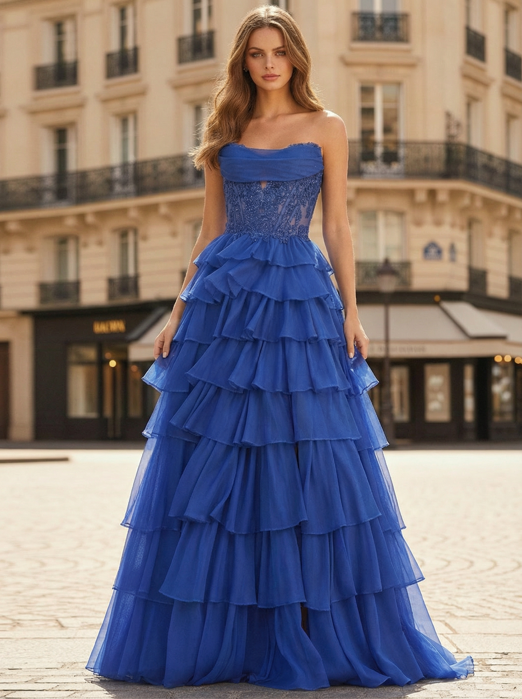 Royal Blue Tiered Ruffle Corset Chiffon A-Line Prom Dress