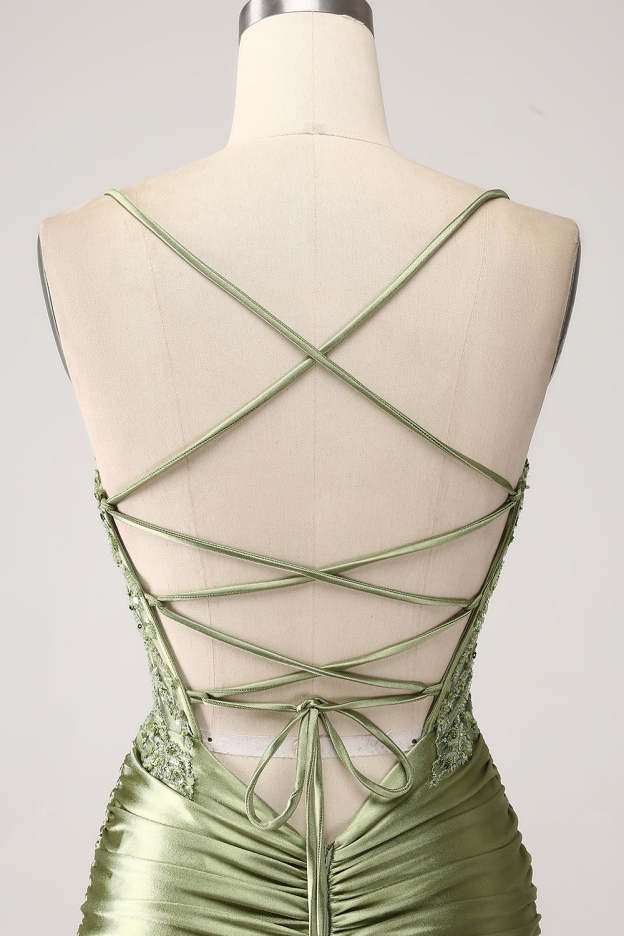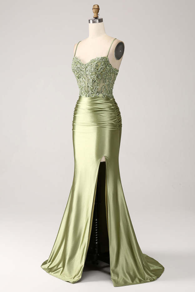 Sage Spaghetti Straps Satin Mermaid Long Prom Dress with Lace Appliques