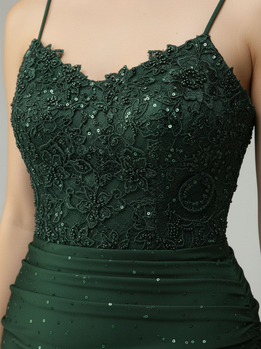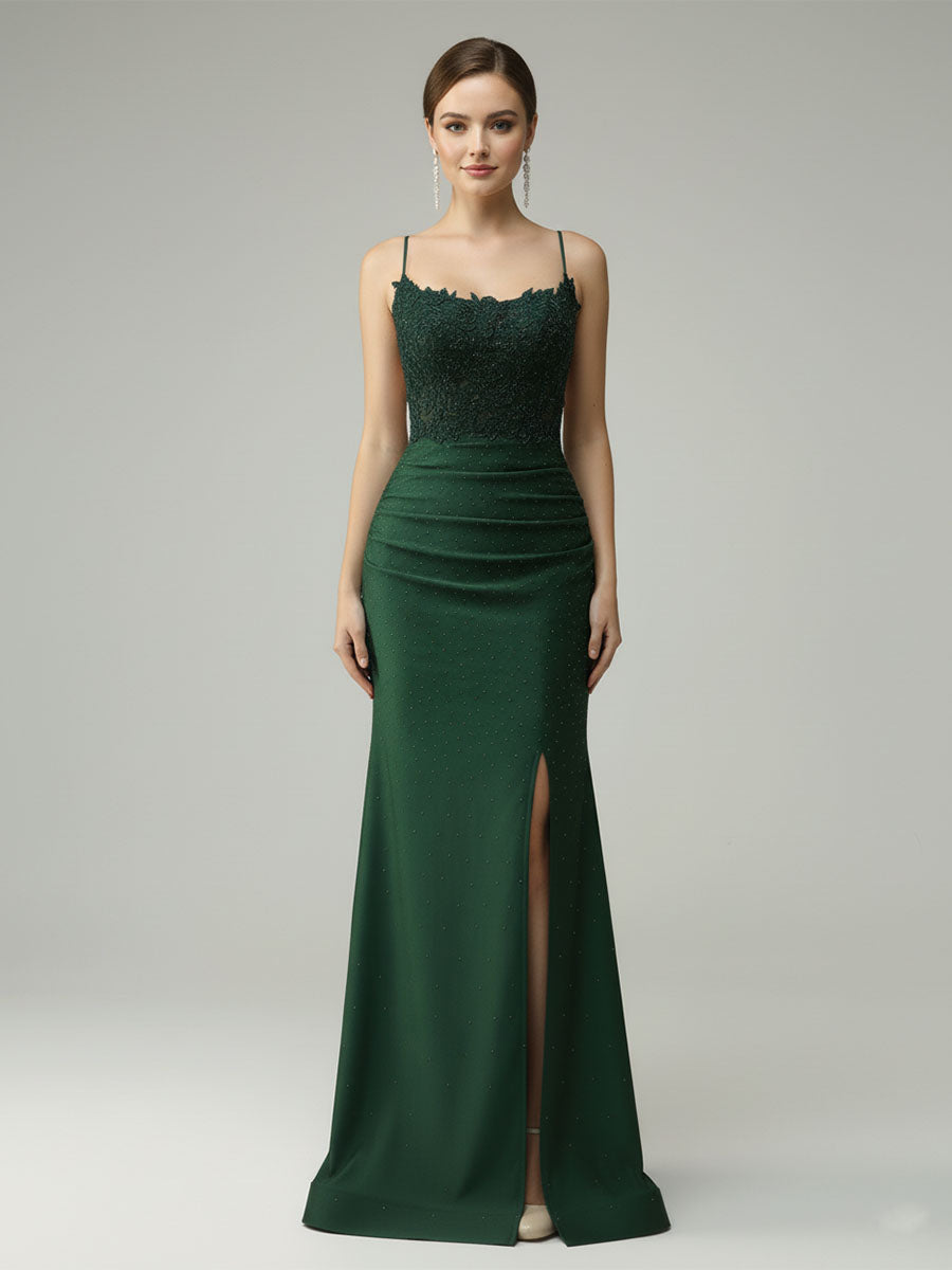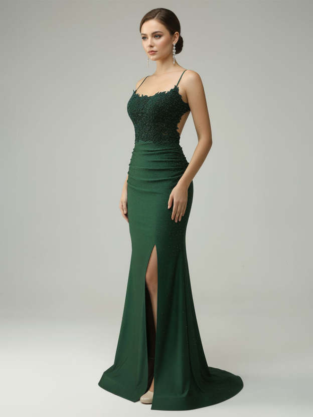Spaghetti Straps Mermaid Halter Beaded Long Prom Dress with Slit