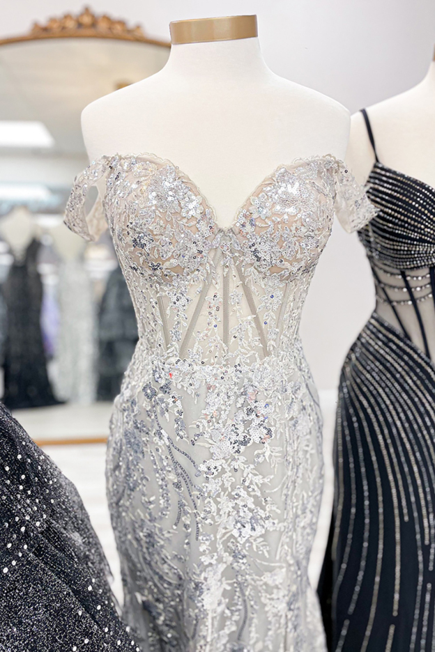 Sparkly Golden Off the Shoulder Mermaid Sequins Long Prom Dress with Slit