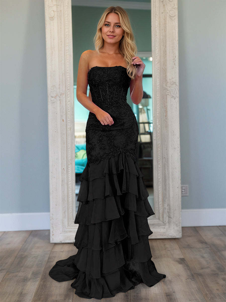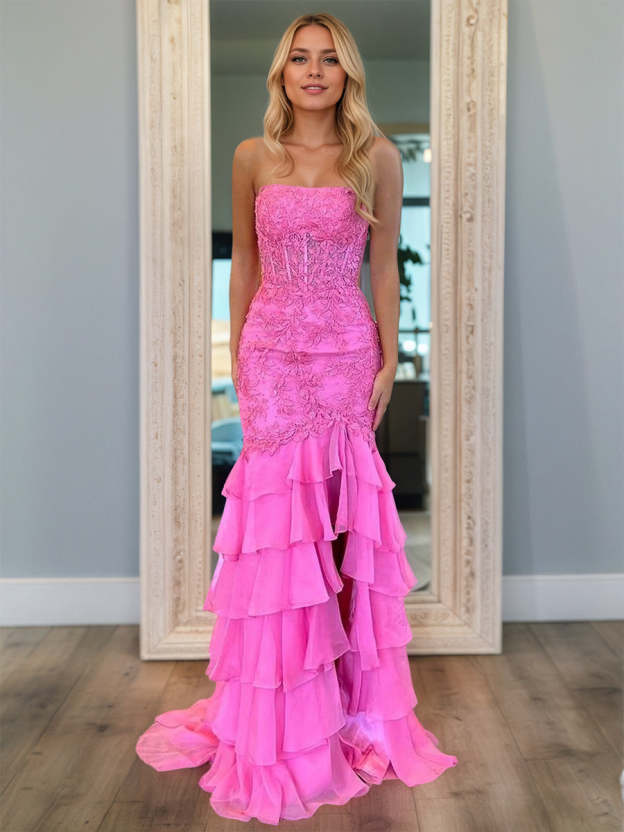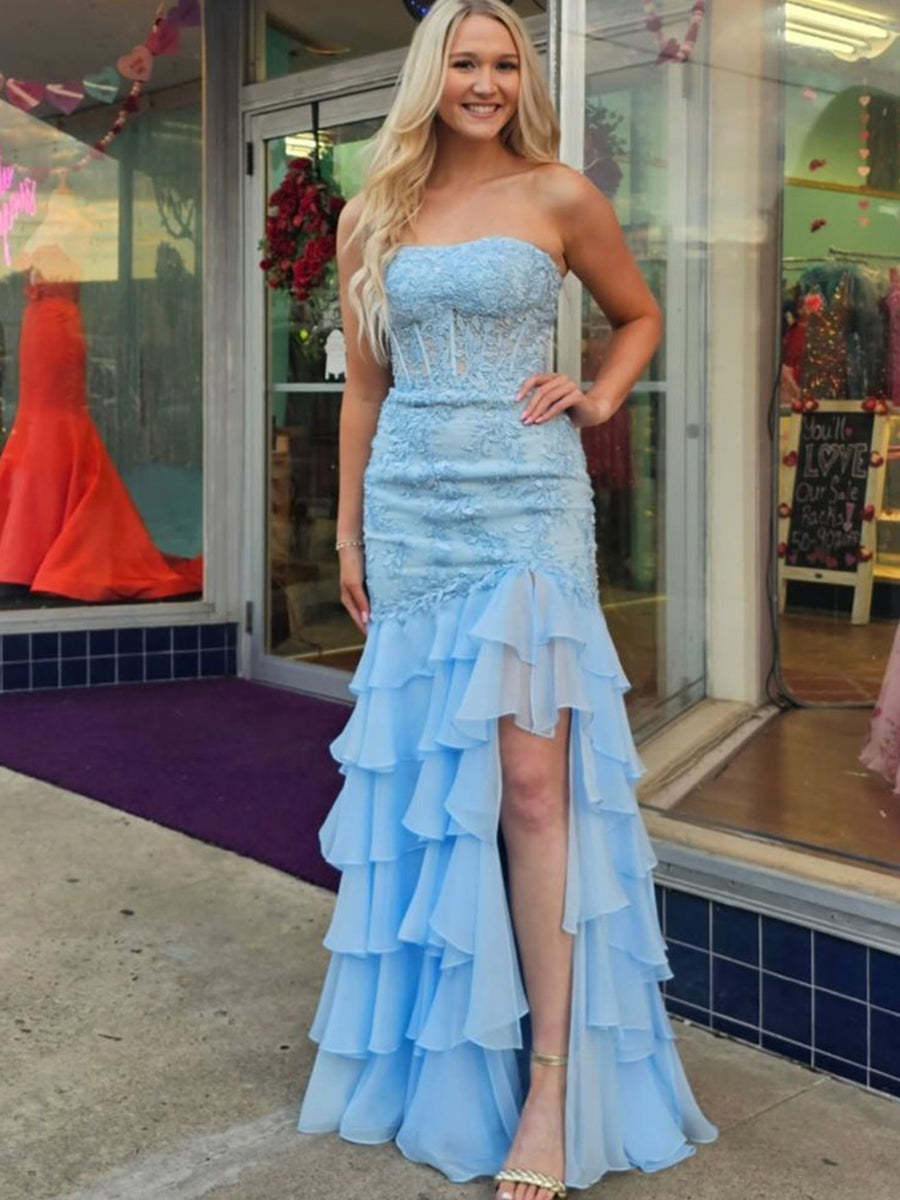 Strapless Applique Ruffle Mermaid Long Prom Dress with Slit