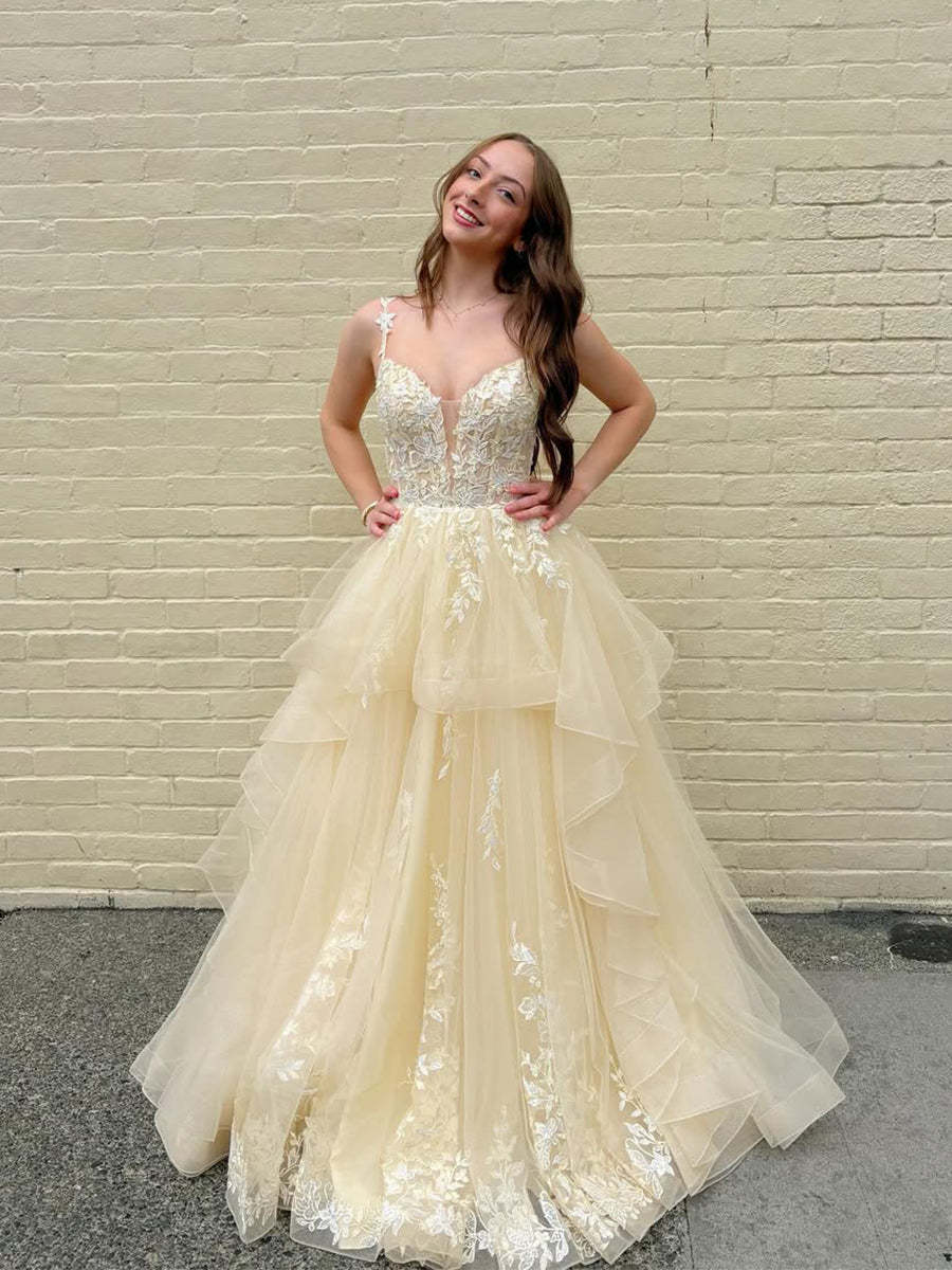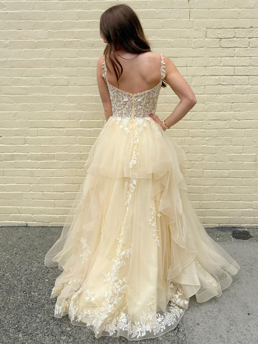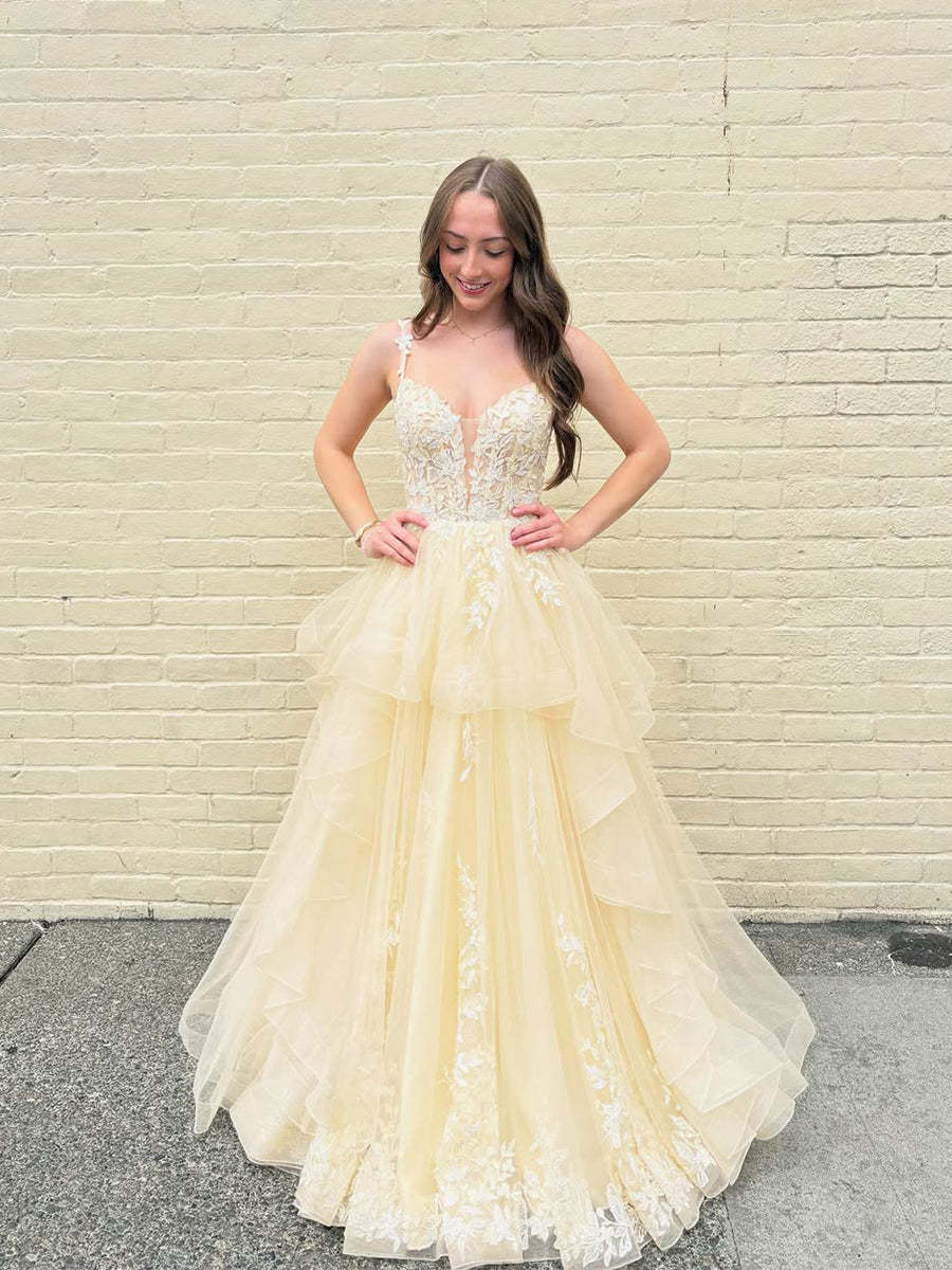 Yellow Tiered Tulle A-Line Long Prom Dress with Floral Lace
